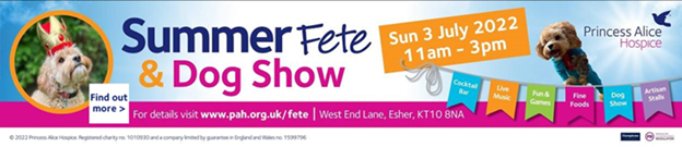 The fete takes place at Princess Alice Hospice, West End Lane, Esher, KT10 8NA on Sunday 3 July, from 11am - 3pm and there’ll be something for everyone: food and drinks, our renowned dog show, entertainment, Bollywood dancing, live music, stalls, displays and lots more besides!
