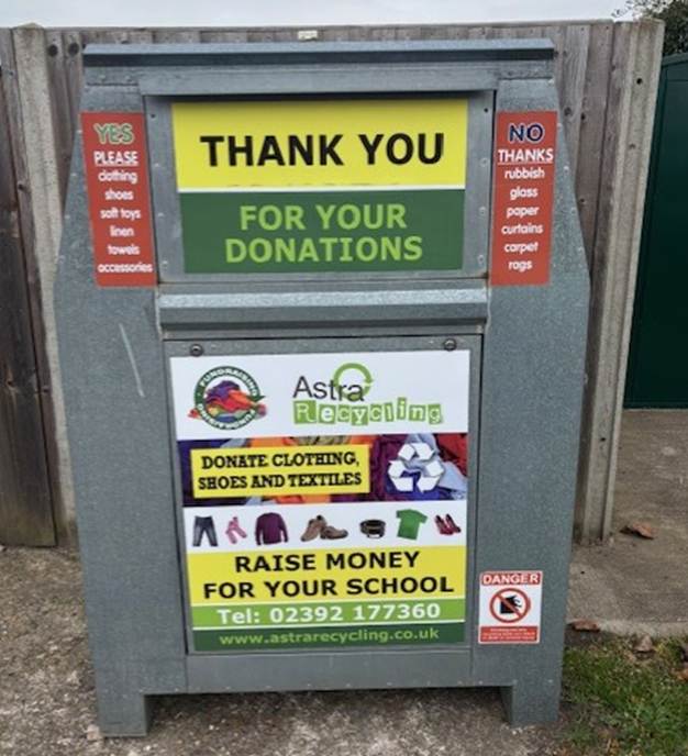 We are very excited to announce we now have a textile recycling bin near the bike racks next to the KS2 double gates around the side of the hall.
